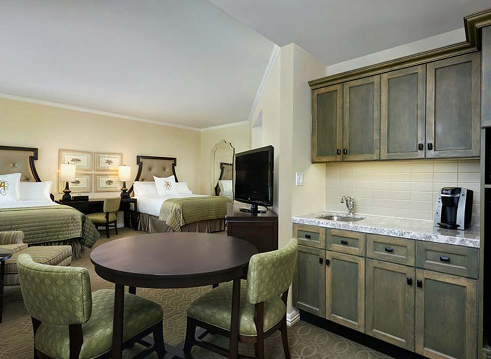 Ideal for extended stays, our 350 square-foot studios come equipped with a kitchenette stocked with all of the necessities. Stretch out in two queen beds and enjoy the three-piece bathroom featuring tub and shower combo.